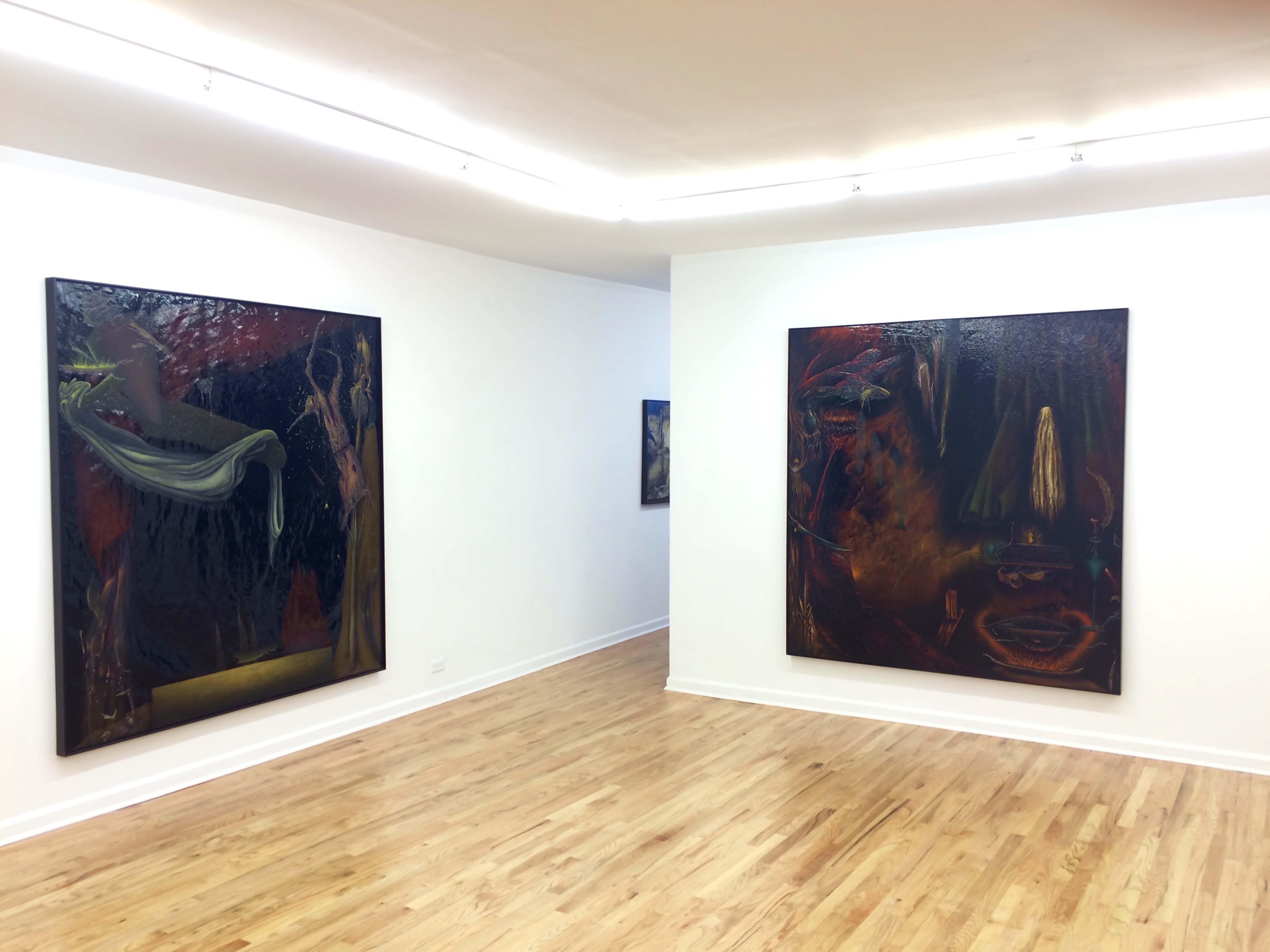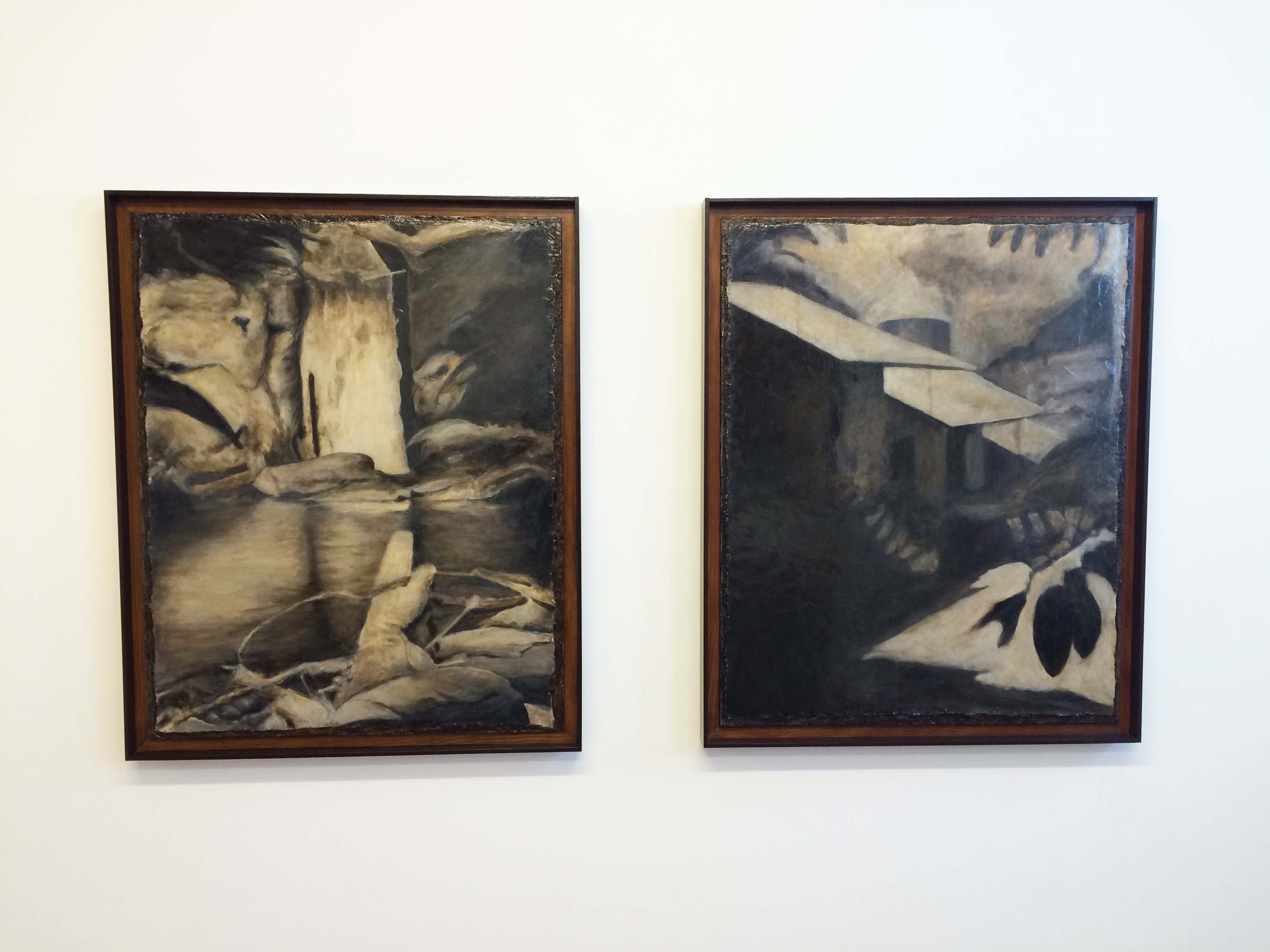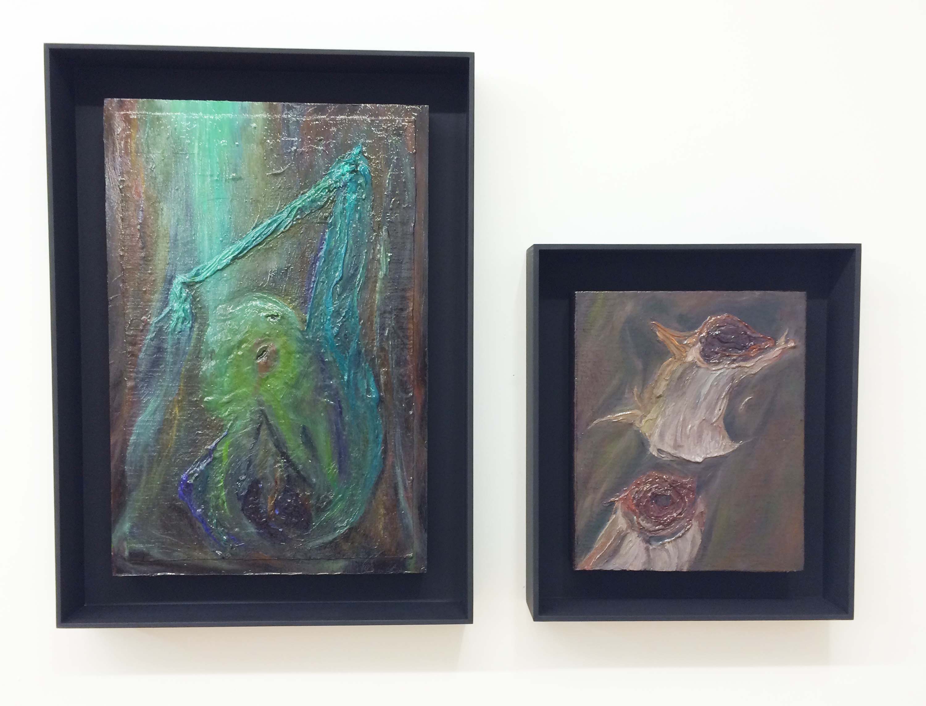 IMG_7186Man sheltering from activated tree stump, 2011-2016 ( 24.5 x 17.75 in.) and Activated tree stump sucked out of tree base, 2012-2016 (17 x 14 in.), both oil on canvas on board.