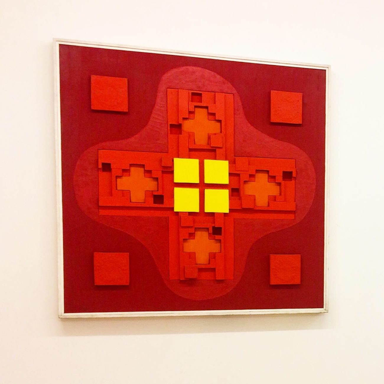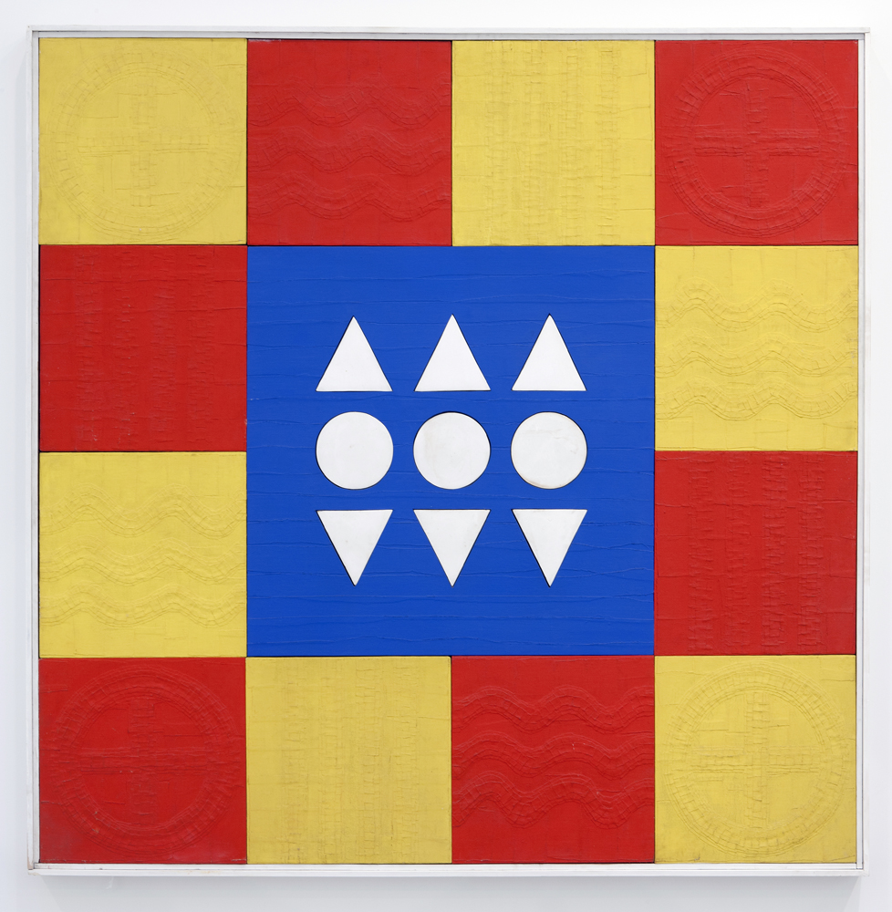 Tales of Love, 1959, plaster, oil, canvas collage on wood, 72 x 72 inches