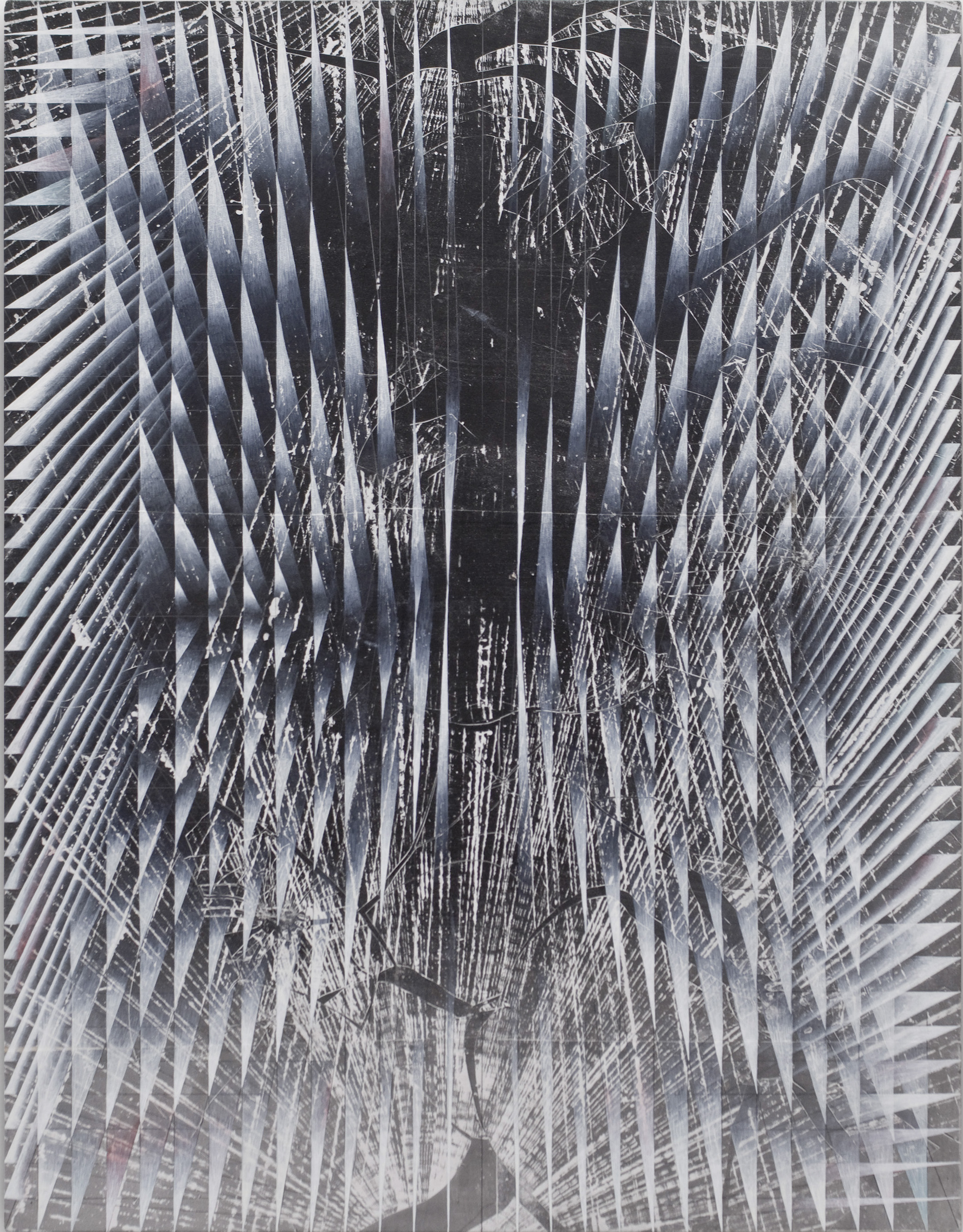 Feathers on a broken drawing, 2016, egg tempera on photogram on wood, 90 x 70 cm